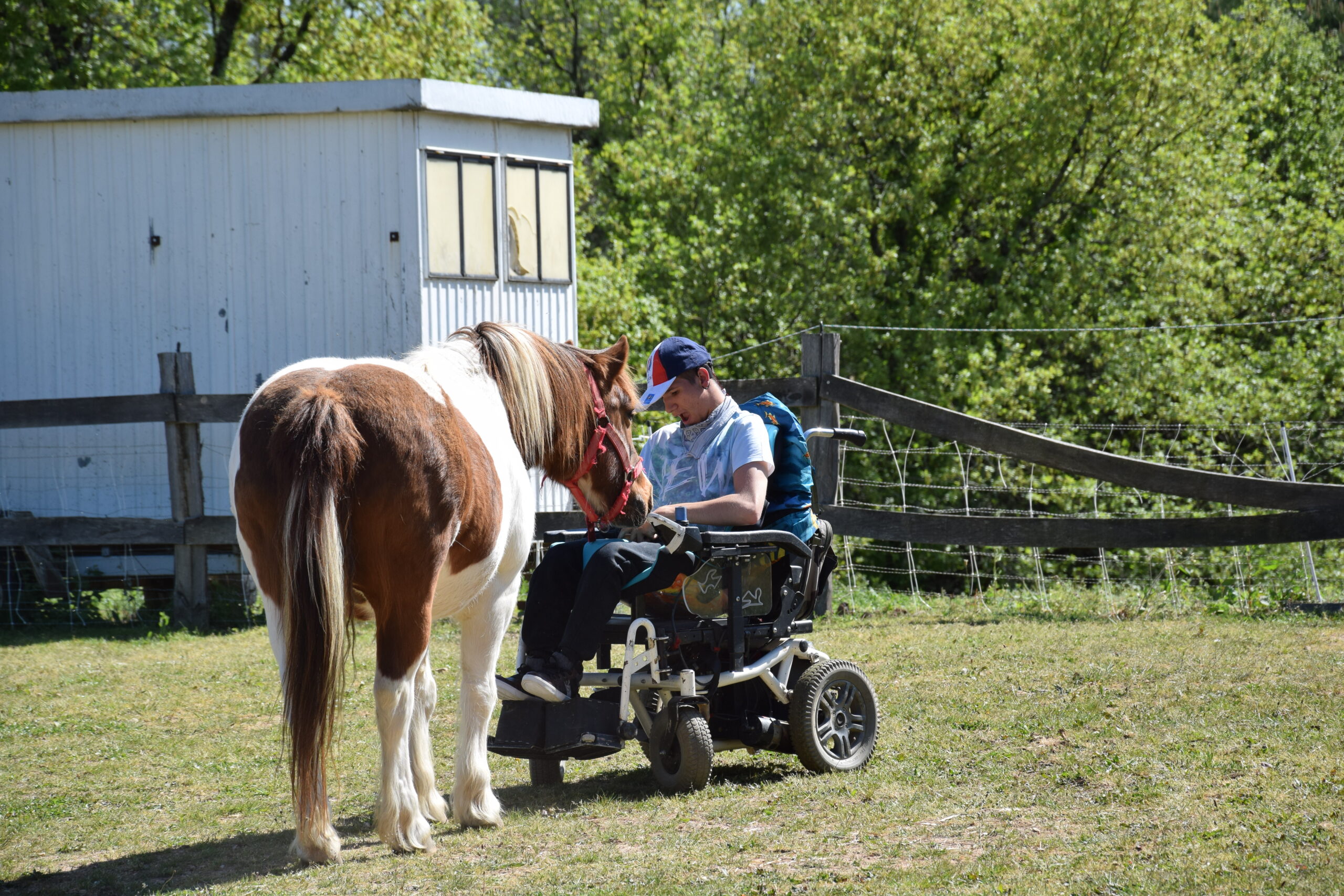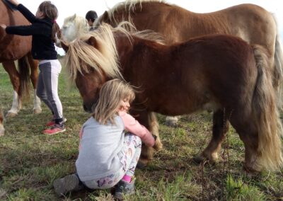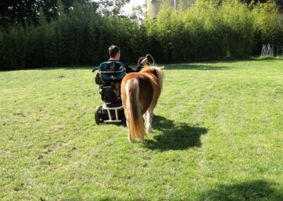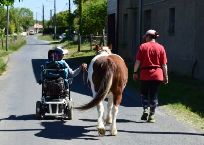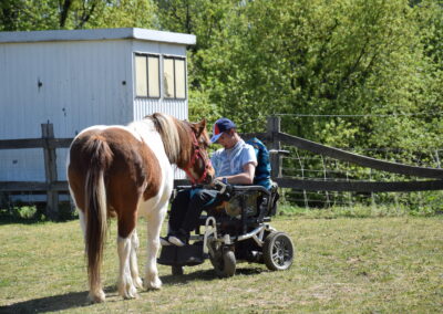 vie, …). Ces visites permettent des temps de rencontre riches et adaptés au capacités de chaque personne. Le contact avec les poneys favorise l’apaisement, la stimulation sensorielle, la communication, les souvenirs et le lien social. Chaque interaction est pensée dans le respect du rythme, des émotions et du besoin des personnes accompagnées. Nous travaillons en étroite collaboration avec le personnel encadrant afin d’adapter les séances aux objectifs éducatifs, thérapeutiques ou bien-être propres à chaque établissement